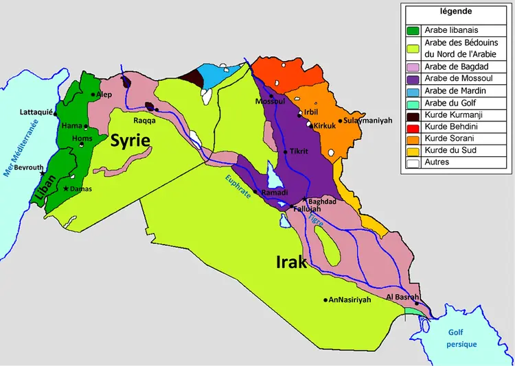 La carte ci-dessous montre les langues arabes et kurdes parlés en Syrie, en Irak et au Liban.